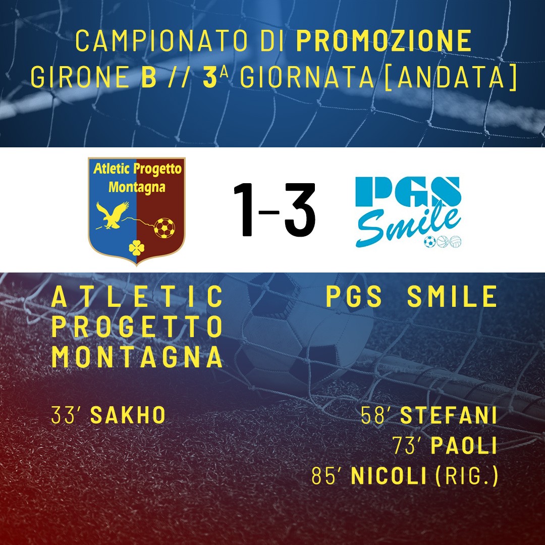 Campionato di Promozione – Girone B // 8^ giornata di andata Atletic Progetto Montagna – PGS Smile 1-3 33′ Sakho (A), 58′ Stefani (B), 73′ Paoli (B), 85′ Nicoli (B) (rig.)