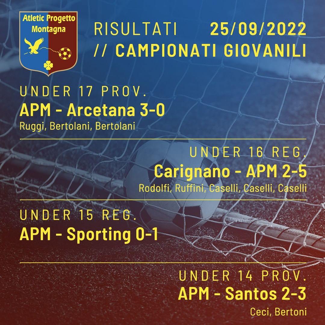 Under 17 Prov. APM – Arcetana 3-0 Ruggi, Bertolani, Bertolani Under 16 Reg. Carignano – APM – 2-5 Rodolfi, Ruffini, Caselli, Caselli, Caselli Under 15 Reg. APM – Sporting 0-1 Under 14 Prov. APM – Santos 2-3 Ceci, Bertoni