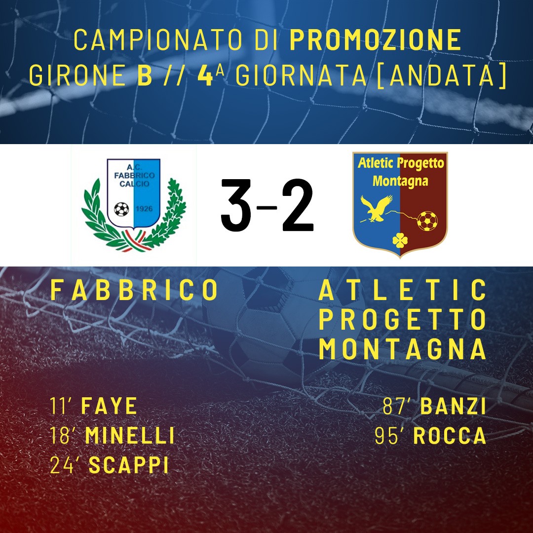 Campionato di Promozione – Girone B // 4^ giornata di andata Fabbrico – Atletic Progetto Montagna 3-2 11′ Faye(F), 18′ Minelli (F), 24′ Scappi (F), 87′ Banzi (A), 95′ Rocca (A)