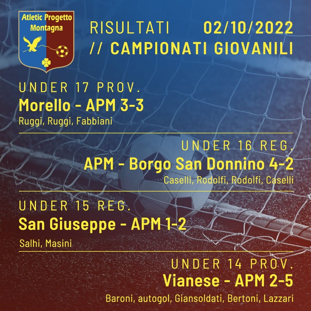 Under 17 Prov. Morello – APM 3-3 Ruggi, Ruggi, Fabbiani Under 16 Reg. APM – Borgo San Donnino 4-2 Caselli, Rodolfi, Rodolfi, Caselli Under 15 Reg. San Giuseppe – APM 1-2 Salhi, Masini Under 14 Reg. Vianese – APM 2-5 Baroni, autogol, Giansoldati, Bertoni, Lazzari