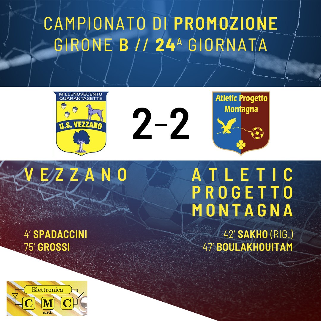 Campionato di Promozione – Girone B // 24^ giornata Vezzano – Atletic Progetto Montagna 2-2 4′ Spadacini (V), 42′ Sakho (A) rig, 47′ Boulakhouitam (A), 75′ Grossi (V)