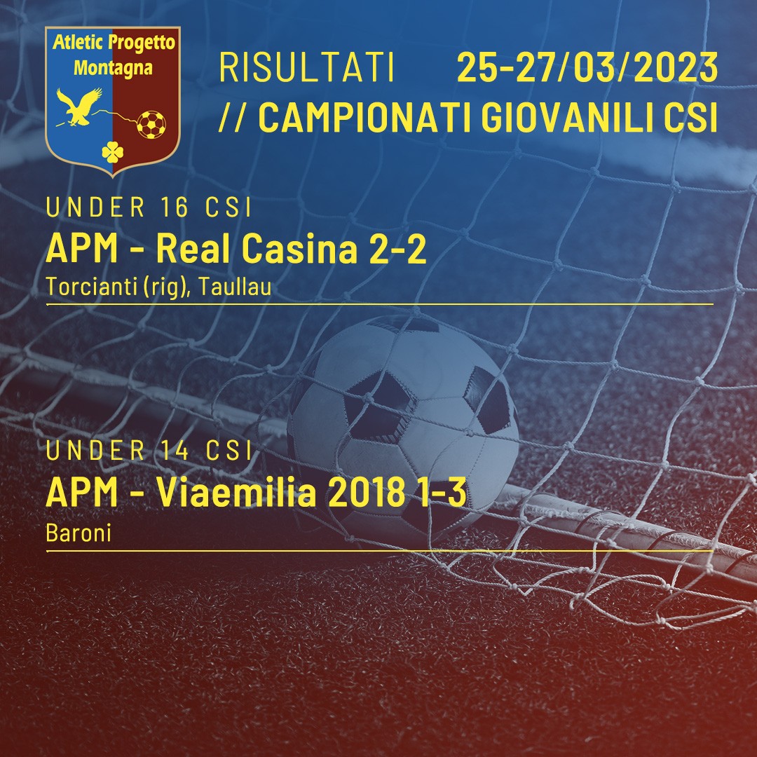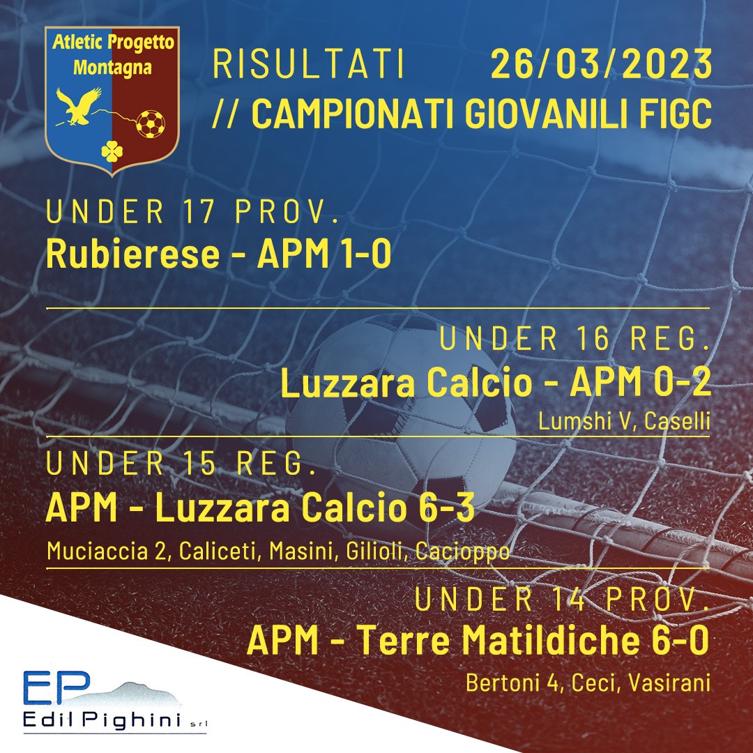 Under 17 FIGC Prov. Rubierese – APM 1-0 Under 16 FIGC Reg. Luzzara Calcio – APM 0-2 Lumshi V, Caselli Under 15 FIGC Reg. APM – Luzzara Calcio 6-3 Mucciaccia, Mucciaccia, Caliceti, Masini, Gilioli, Cacioppo Under 14 FIGC Prov. APM – Terre Matildiche 6-0 Bertoni, Bertoni, Bertoni, Bertoni, Ceci, Vasirani