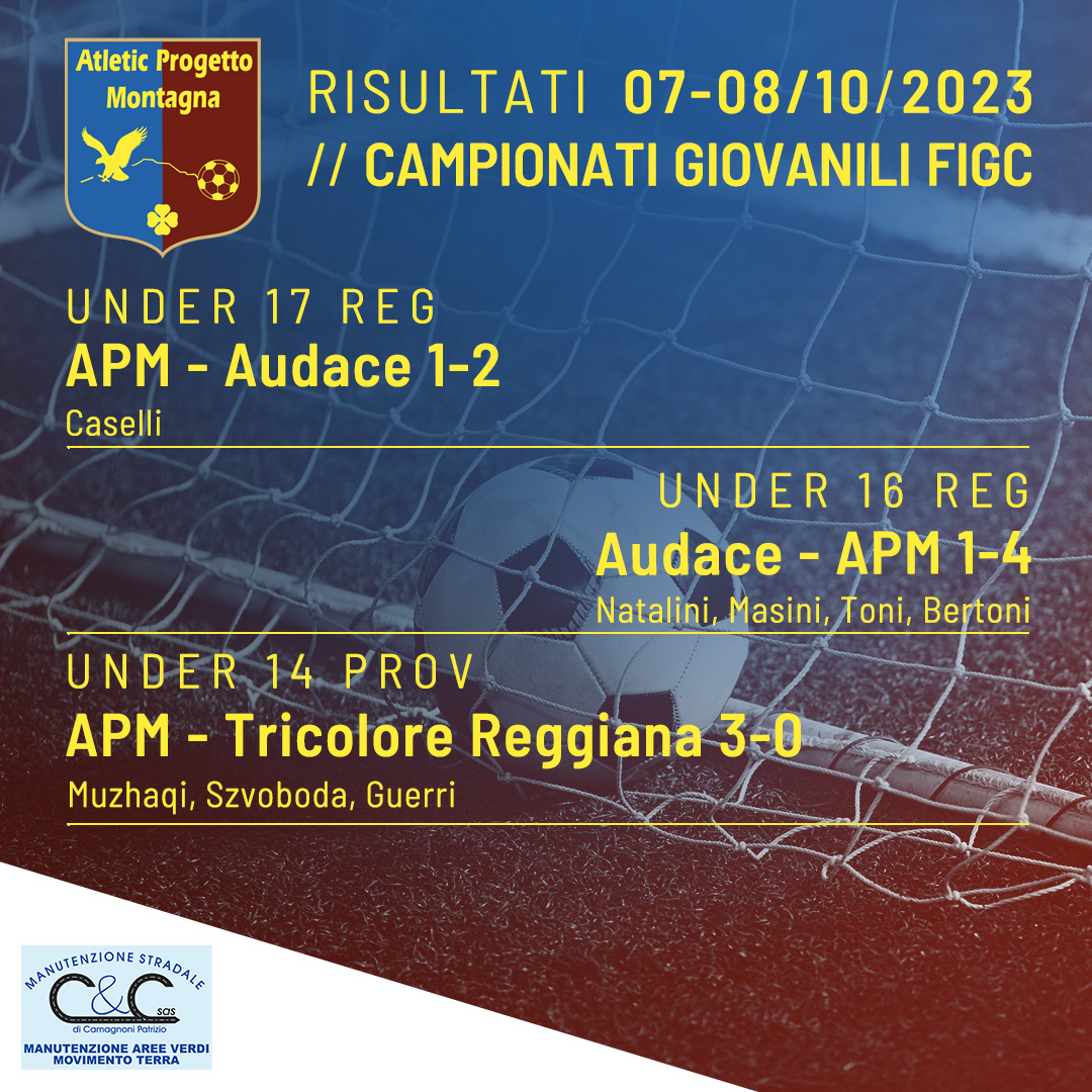Under 17 FIGC Reg. APM – Audace 1-2 Caselli Under 16 FIGC Reg. Audace – APM 1-4 Natalini, Masini, Toni, Bertoni Under 14 FIGC Prov. APM – Tricolore Reggiana 3-0 Muzhaqi, Szvoboda, Guerri