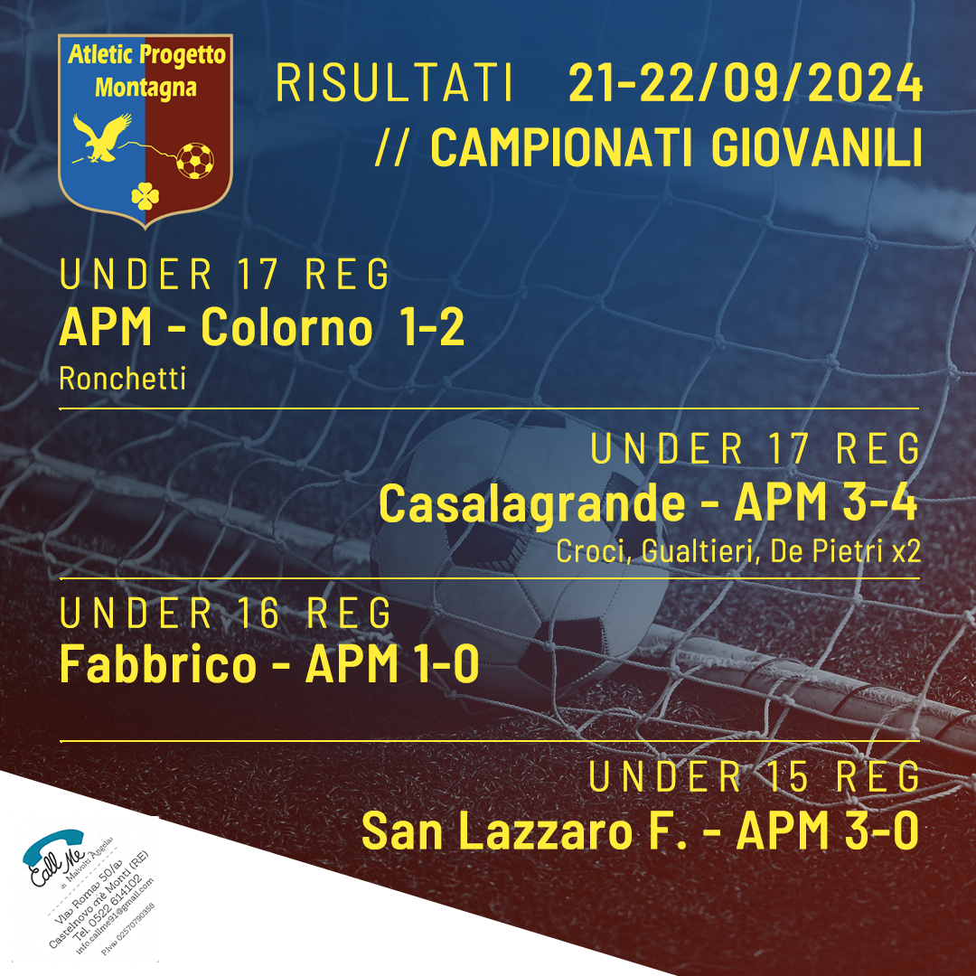 Under 17 FIGC Reg. APM – Colorno 1-2 Ronchetti Under 17 Reg. Casalgrande -APM 3-4 Croci, Gualtieri, De Pietri x2 Under 16 FIGC Reg. Fabbrico – APM 1-0 Under 15 Reg. San Lazzaro F. – APM 3-0