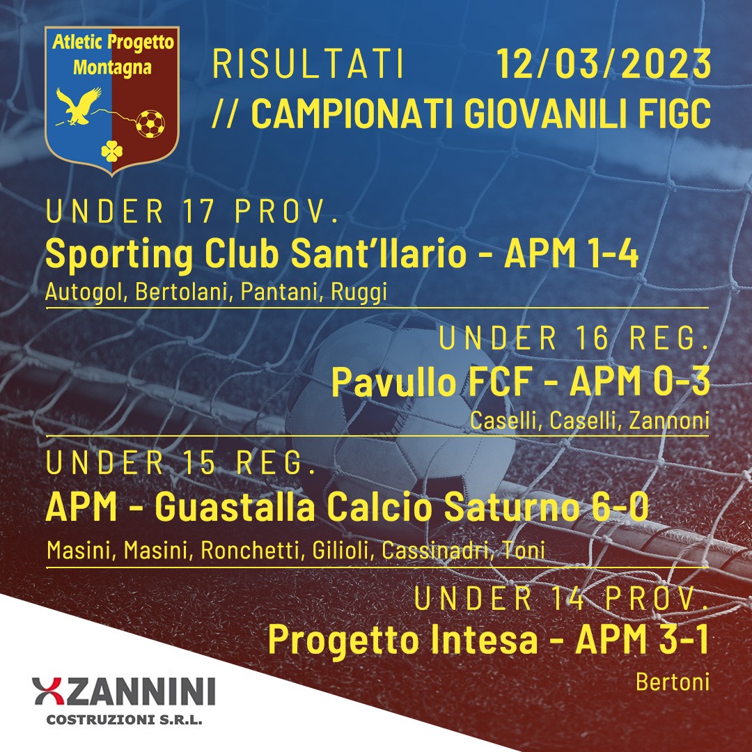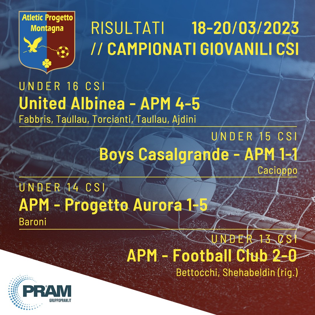Under 16 CSI United Albinea – APM 4-5 Fabbris, Taullau, Torcianti, Taullau, Ajdini Under 15 CSI Boys Casalgrande – APM 1-1 Cacioppo Under 14 CSI APM – Progetto Aurora 1-5 Baroni Under 13 CSI APM – Football Club 2-0 Bettocchi, Shehabeldin (rig)Read More
