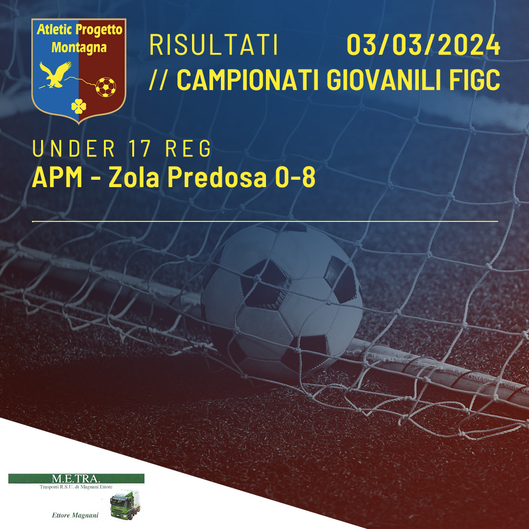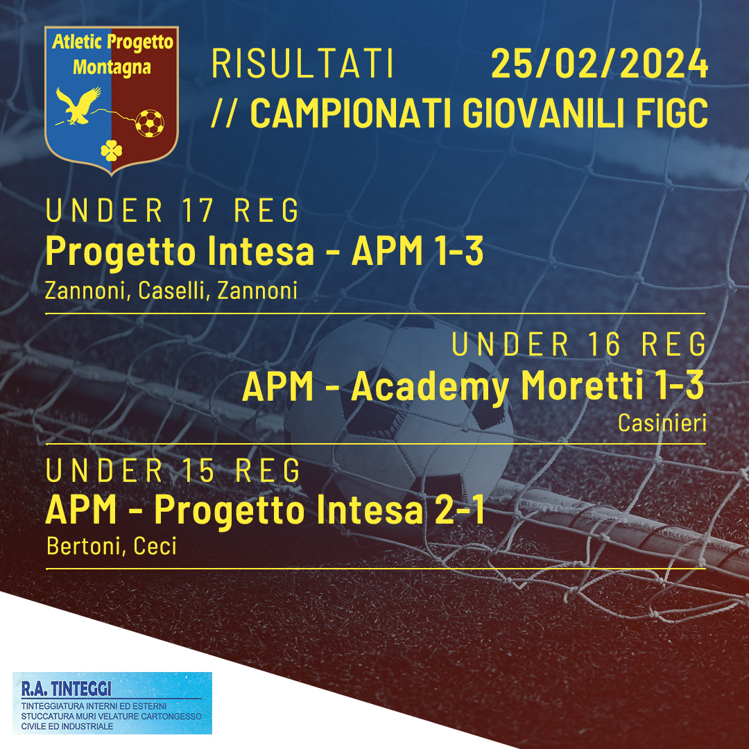 Under 17 FIGC Reg. Progetto Intesa – APM 1-3 Zannoni, Caselli, Zannoni Under 16 FIGC Reg. APM – Academy Moretti 1-3 Casinieri Under 15 FIGC Reg. APM – Progetto Intesa 2-1 Bertoni, Ceci Read More