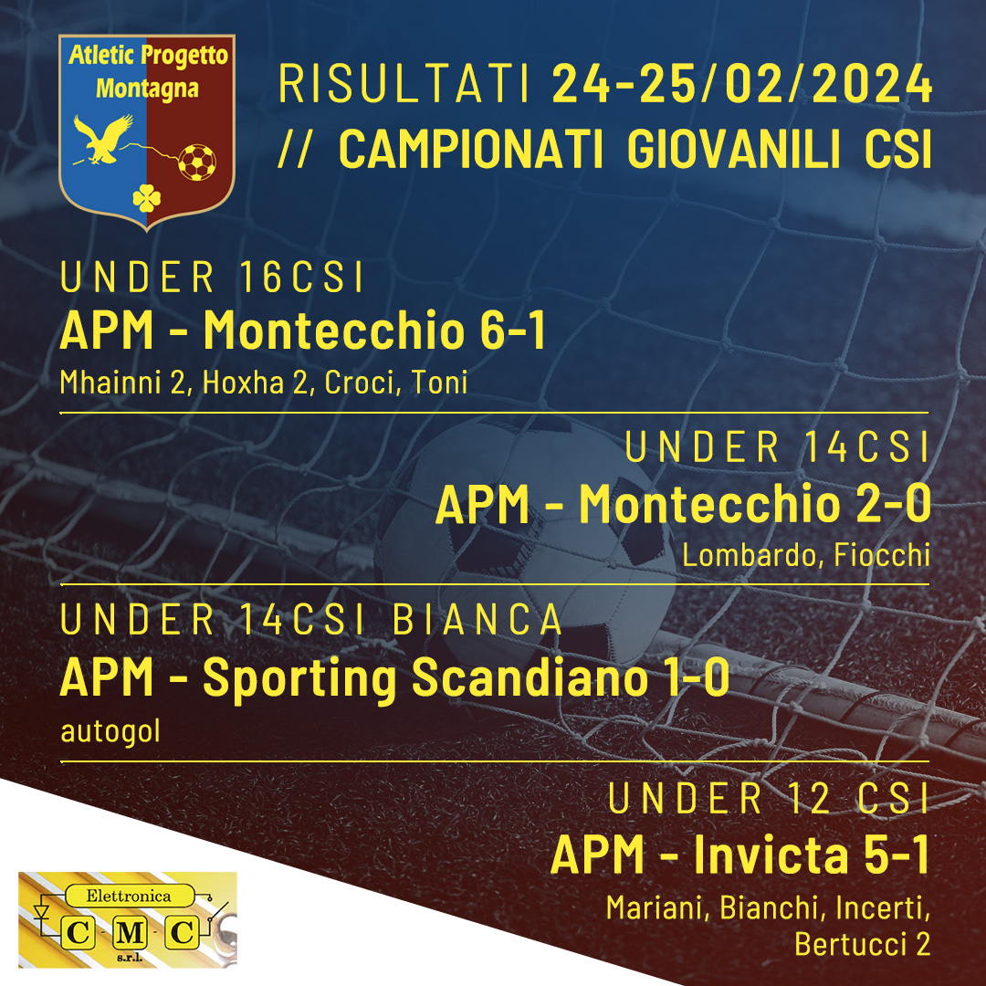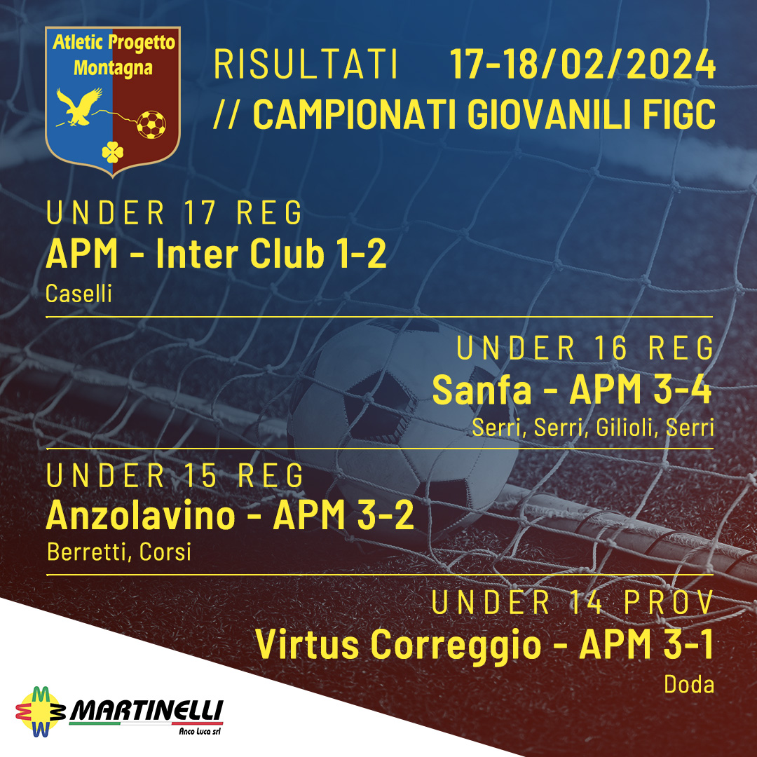 Under 17 FIGC Reg. Progetto Intesa – APM 1-3 Zannoni, Caselli, Zannoni Under 16 FIGC Reg. APM – Academy Moretti 1-3 Casinieri Under 15 FIGC Reg. APM – Progetto Intesa 2-1 Bertoni, Ceci Read More