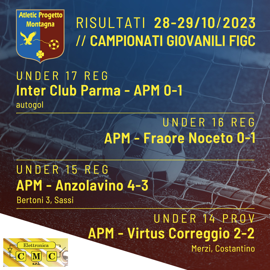 Under 17 FIGC Reg. Inter Club Parma – APM 0-1 autogol Under 16 FIGC Reg. APM – Fraore Noceto 0-1 Under 15 FIGC Reg. APM – Anzolavino 4-3 Bertoni, Bertoni, Bertoni, Sassi Under 14 FIGC Prov. APM – Virtus Correggio 2-2 Merzi, Costantino